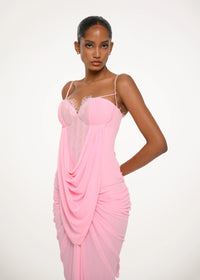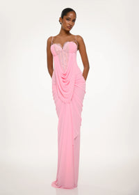 A soft pink gown with a lace-trimmed neckline and cascading draped skirt — graceful, luminous, and undeniably elegant.