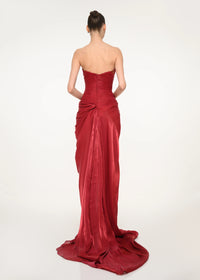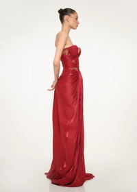 A burgundy dress featuring a sculpted strapless bodice with lace cutouts and draping - sensual craftsmanship designed to celebrate confidence and refined femininity.