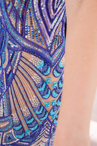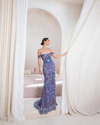 Immerse yourself in the allure of the Celestia Mirage Dress, a breathtaking haute couture creation that celebrates feminine strength and divine grace. This maxi evening gown features an off-shoulder Bardot neckline that accentuates the décolletage with timeless sophistication. Hand-embellished with intricate beadwork and sequins in radiant shades of royal blue and violet, it contours the silhouette in an elegant mermaid fit that flows into a graceful train. Crafted from luxurious embroidered silk and tulle, the dress captures light with every movement, evoking the magic of midnight opulence. Perfect for red-carpet moments, gala nights, or couture celebrations, this piece redefines modern glamour with its sculptural lines and impeccable craftsmanship.