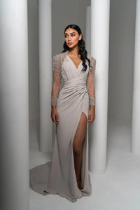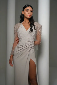 Radiate timeless sophistication with the Celestia Pearl Elegance Dress, a couture creation designed for modern luxury. This maxi dress features a graceful V-neckline paired with intricately draped crepe fabric that sculpts the waist and elongates the silhouette. The highlight lies in the pearl-embellished sheer sleeves, which shimmer with every movement, offering an ethereal glow. A daring thigh-high slit adds allure while maintaining refined elegance. Crafted in soft taupe crepe, this gown flows seamlessly into a modest train, combining sensuality with grandeur. Perfect for red-carpet events, formal galas, and distinguished soirées, this haute couture piece captures the essence of opulence and feminine power. Step into the spotlight with an unforgettable masterpiece tailored for unforgettable evenings.