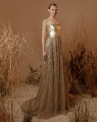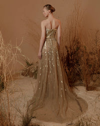 The Gilded Starlight Dress is the embodiment of couture radiance, designed for the woman who commands the spotlight with elegance and power. This strapless A-line evening gown features a striking straight neckline paired with a structured gold-sequined bodice, creating a bold, luminous effect. Flowing from the waist, the gown transforms into a cascading sheer tulle skirt embellished with scattered golden sequins, mimicking the twinkle of starlight against the night sky. Crafted in a warm champagne gold tone, it radiates sophistication and opulence, making it the perfect choice for gala nights, luxury soirées, or red-carpet appearances. The seamless balance of structure and fluidity ensures both comfort and grandeur. A true haute couture masterpiece, the Gilded Starlight Dress guarantees an unforgettable presence, shimmering with every movement.