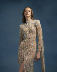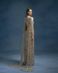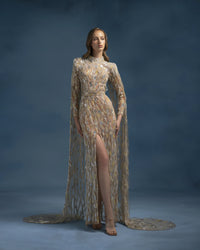 Illuminate any evening with the Golden Aurora Dress, a couture marvel that captures celestial radiance. This maxi gown features a dramatic floor-sweeping cape, delicately adorned with intricate golden embroidery and shimmering sequins. The crew neckline offers timeless refinement, while the daring thigh-high slit adds a modern, alluring twist. Crafted from exquisite silk and mesh blend, the fabric glistens with every movement, evoking a goddess-like aura. With its radiant gold tones and flowing silhouette, this dress is designed for grand soirées, weddings, and luxury galas where every detail demands attention. A breathtaking choice for those who want to command the spotlight.