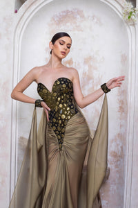 Radiate divine energy in the Golden Dusk Dress, a haute couture maxi gown that redefines red carpet glamour. Featuring a bold, sculpted sweetheart neckline and a corset-style bodice adorned with golden appliqué, this design channels goddess-level confidence. The bodice cinches at the waist, transitioning into sheer mesh panels and cascading silk drapes that flow with every step. Dramatic pleating and expertly placed ruching add movement and artistry to the silhouette, while its muted olive gold tone brings a rare and regal sophistication. This gown is both seductive and statuesque — a perfect harmony of modern design and timeless elegance. Finished with a long, flowing train and matching wrist cuffs, this is a showstopper crafted for those who command attention.