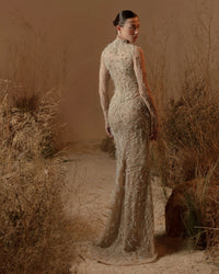 Illuminate the night in the Golden Eclipse Dress, a haute couture creation that blends artistry with refined sophistication. This long-sleeve column gown features a striking high neckline, offering a statuesque silhouette that elongates the figure with regal grace. Crafted in sumptuous sheer tulle over silk, it is fully embellished with hand-applied crystal and metallic beadwork, forming radiant starburst patterns that glisten with every movement. The form-fitting design flows seamlessly into a floor-length finish, exuding both strength and femininity. Rendered in a luxurious champagne silver hue, the gown captures light with mesmerizing brilliance, making it an exceptional choice for gala evenings, couture showcases, or red-carpet affairs. A true masterpiece, the silver Eclipse Dress embodies haute couture at its finest — bold, radiant, and unforgettable.