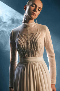 The Ivory Aura Dress embodies pure sophistication, designed for the woman who seeks understated grandeur with a couture touch. This long-sleeve evening gown features a refined high mandarin neckline paired with a delicately embroidered bodice adorned with shimmering beadwork that radiates like soft light. The cinched waistline flows into a cascading silk chiffon skirt, offering fluid movement and an ethereal presence with every step. Presented in a luminous ivory cream shade, the gown captures both modern elegance and classic refinement. Its statuesque silhouette makes it an ideal choice for gala evenings, luxury soirées, or red-carpet affairs. With meticulous detailing and impeccable craftsmanship, the Ivory Aura Dress is more than couture — it is a luminous expression of femininity, grace, and timeless allure.