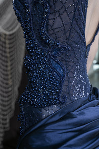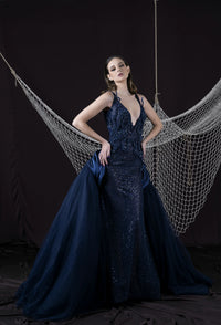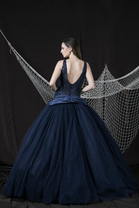 Make a dramatic entrance in the Nocturna Siren Dress, a breathtaking couture creation that fuses sensuality with elegance. This maxi gown features a daring plunging neckline, accentuated by a form-fitted bodice encrusted with shimmering sequins that cascade down the silhouette. Crafted in deep navy silk and mesh, the design is enriched with sparkling beadwork, creating a constellation-like effect. Flowing from the hips, a voluminous layered overskirt in navy tulle adds grandeur and fluidity, ensuring unforgettable movement on the red carpet. The gown’s artistry lies in its contrast of sultry sophistication and dramatic couture flair. Perfect for gala evenings, exclusive events, and high-fashion occasions, the Nocturna Siren Dress embodies bold femininity and timeless luxury.