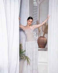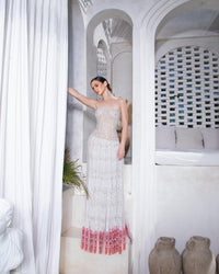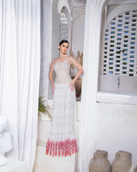 Radiating understated opulence, the Opaline Grace Dress captures the essence of timeless couture artistry. This maxi gown features a strapless neckline with a structured corset bodice, meticulously hand-embroidered with delicate crystal beadwork and silver threads. Crafted from embroidered lace and silk tulle, the gown cascades gracefully into a skirt adorned with intricate red embroidery along the hem — a striking contrast that embodies modern femininity and classic allure. The silhouette flatters every curve, creating a fluid harmony between light, texture, and movement. Ideal for gala events, bridal couture soirées, or luxury red-carpet appearances, the Opaline Grace Dress epitomizes haute couture refinement — a symphony of grace, luminosity, and divine craftsmanship.
