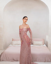 Radiate confidence and grace in the Rosalia Éclat Dress, a couture statement of feminine allure and sophistication. This maxi evening gown features a sleek off-shoulder neckline and long sheer sleeves delicately embroidered with blush sequins that shimmer with every movement. Sculpted in a figure-hugging silhouette, the gown flows into a subtle mermaid train that elongates the body with fluid elegance. Crafted from luxurious sequined tulle and silk lining, its blush-rose hue evokes romance and refined glamour, perfect for high-profile soirées, galas, or red-carpet moments. Every inch reflects the artistry of haute couture craftsmanship — where passion, precision, and luminosity unite to create a dress that embodies modern luxury and eternal beauty.