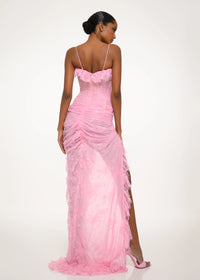 A pink lace gown featuring structured corsetry, delicate straps, and a daring slit — soft romance meets bold energy.