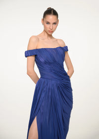 A royal blue off-shoulder dress crafted from satin with elegant draping - a timeless silhouette that radiates confidence, grace, and modernity.
