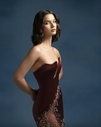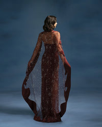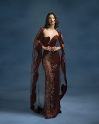 Command the spotlight in the Scarlet Eclipse Dress, a couture masterpiece of bold passion and refined glamour. This maxi gown in deep crimson satin features a sculpted plunging sweetheart neckline and sheer beaded cape sleeves that flow with ethereal elegance. The body-hugging silhouette is enhanced with shimmering embellishments, creating a captivating interplay of opacity and transparency. Crafted from satin and embellished mesh, this gown is designed for powerful entrances at galas, high-fashion soirées, and red-carpet moments. Its fiery hue and celestial sparkle make it a daring yet timeless expression of luxury couture.