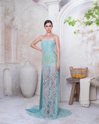 Evoke the magic of the sea in the Seafoam Whisper Dress, a luxurious maxi-length gown that blends soft elegance with couture craftsmanship. Designed with a strapless neckline, this silhouette highlights the shoulders and décolletage with effortless grace. The dress features a structured bodice that melts into a sheer mesh overlay, delicately embroidered with sea-inspired patterns in silver and mint. Beneath the lace-like beading, a fitted underlay offers both coverage and contour. Flowing into a subtle train, the gown glimmers with movement and light. Crafted from premium mesh and silk, and finished in a breathtaking aqua blue and soft silver, this dress is the epitome of ethereal luxury. Perfect for destination weddings, gala evenings, or any moment that calls for divine elegance.