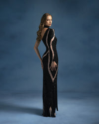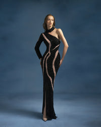 The Starlit Mirage Dress captivates with its bold contrasts and sculptural elegance. This maxi gown, meticulously hand-embellished with sequins, features fluid pink and black wave patterns that contour the body with striking precision. The asymmetric neckline with a single long sleeve enhances its modern allure, while the daring thigh slit adds a sensual touch. Designed in mesh and beaded fabric, the shimmering finish evokes a play of starlight and shadow. Perfect for high-profile soirées, gala dinners, and red-carpet entrances, this dress ensures a look that is both unforgettable and unapologetically glamorous.