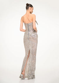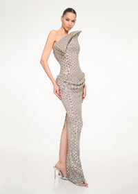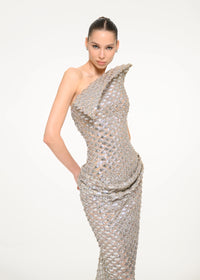 Not draped, engineered: a strike of light in sculptural form.